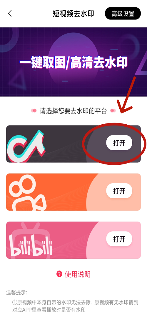 选择需要去水印的短视频平台(本教程以抖音为例)