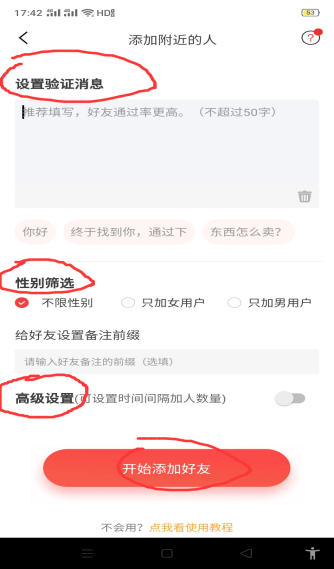 这个界面可以设置验证消息、性别筛选、设置时间间隔加人数量,点击开始添加好友。